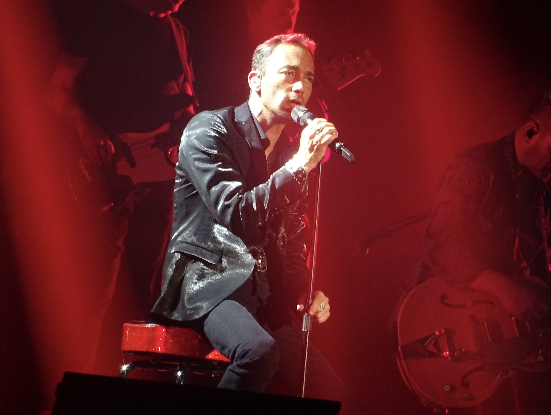 « Je me souvient de la première fois où j’ai entendu cette voix. C’était à Paris au Palais Omnisport de Paris, un soir de septembre 1992, j’avais neuf ans ». C’est avec ces premiers mots que Jean-Baptiste Guegan fait son apparition dans une pénombre bleutée. Un souvenir marquant pour le petit breton qu’il était, devenu un tournant pour son avenir personnel et professionnel. « Et tout à coup il fut là, devant moi, l’Homme qui allait changer ma vie, celui à qui je dois tout, celui qui a balayé mes doutes et mes tourments. Un seul nom, Johnny » conclut-il son introduction sous l’acclamation générale. Un public remué dés les premières secondes par sa ressemblance vocale plus que troublante. Un choc incroyable accéléré à l’allumage de dizaine de spots couleur rouge flamboyant révélant un grand orchestre, deux choristes et au centre la tête d’affiche du jour tout de «Noir c’est noir » vêtu. Veste en cuire, ceinture cloutée et chapelet, la parfaite panoplie «Rock N Roll Attitude » pour se fondre parfaitement dans la peau de Johnny Hallyday. Une légende dont il ranime le répertoire tout au long de la soirée avec beaucoup de puissance. De « Fils de personne » aux réputés « Tennessee » ou «Gabrielle » en passant par les poignants « Marie » et « Diego ». Des prestations sans conteste d’une éloquence bluffante. Un interprète charismatique qui semble comme habité par la force de celui qu’il assure lui-même « sera toujours le plus grand dans nos coeurs ». Un immense showman dont il se montre le digne successeur tant dans l’attitude que dans les gestes. Trainage de pied de micro, mouvements de jambes, dandinement ou encore lancé de médiator pour un jeu de scène captivant la foule survoltée. En majeur partie des cinquantenaires et inconditionnels de Johnny dont certains en veste à son effigie. Des fidèles replongeant avec grand enthousiasme dans « Le bon temps du Rock And Roll ». Une nostalgie heureuse au coeur des vestiges de leur jeunesse à en transformer le concert en bal dansant sur des standards de l’époque comme « Souvenirs souvenirs » ou « Joue pas de Rock’N’Roll pour moi ». Un public chaud bouillant à qui il tend la main à de nombreuses reprises. Jusqu’à aller à traverser la salle sur sa retentissante reprise de « L’envie » à y laisser sans voix.