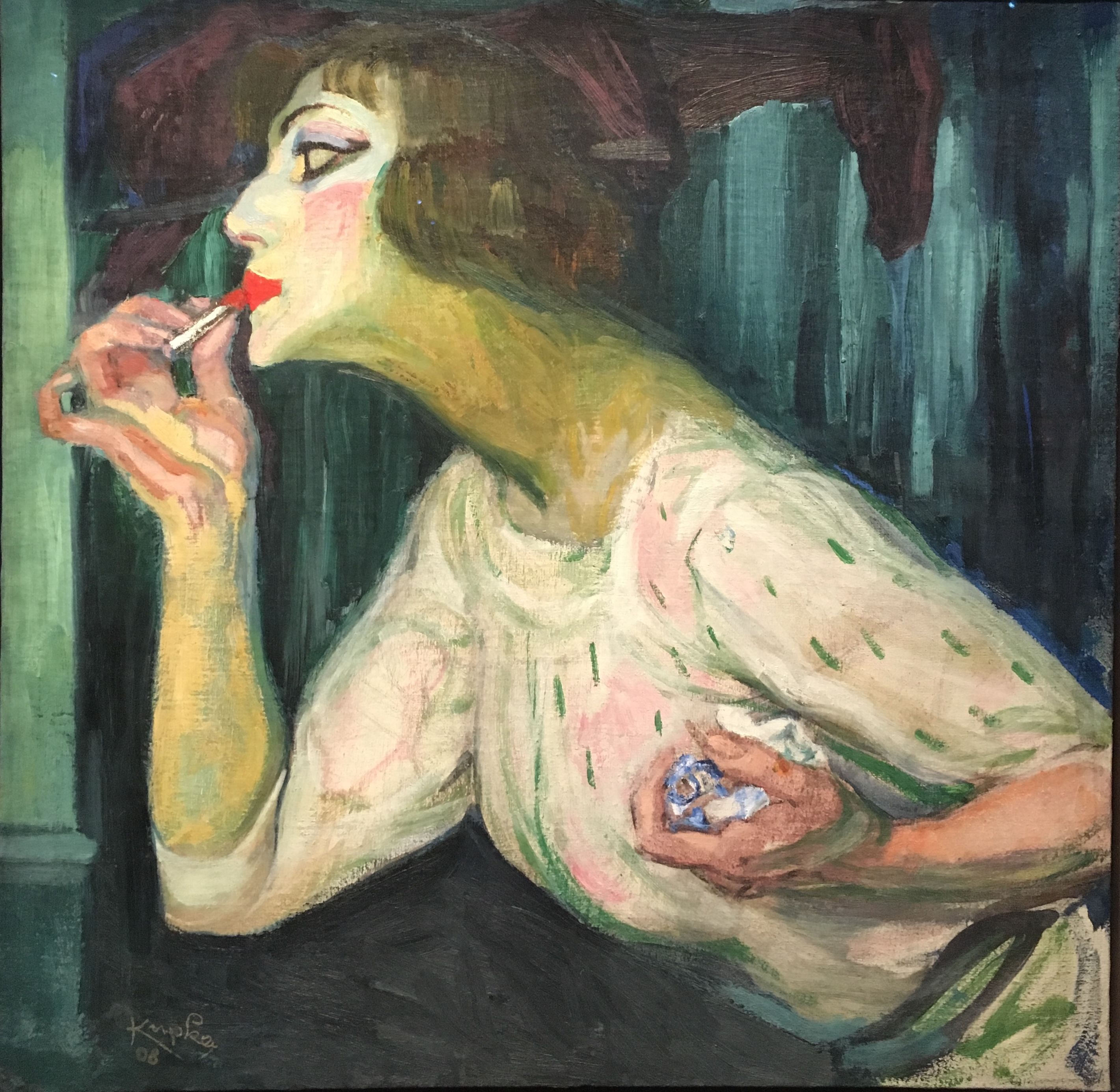 Revenant à la peinture, Kupka se laisse séduire par la couleur. Quittant ses charmantes bourgeoises et son académisme, il projette sur ses toiles des personnages d’une grande intensité aux teintes criardes. A travers les portraits de ses « Gigolettes » l’on voit ainsi s’opérer une fabuleuse stylisation de sa touche : les traits de ses muses s’empâtent, leurs paupières se fardent de khôl, quant à leurs lèvres lippues, elles deviennent si rouges qu’elles frôlent la vulgarité. A mi-chemin entre un art fauve et une sensibilité expressionniste, Kupka nous livre là l’une de ses périodes les plus belles et les plus sensuelles !!