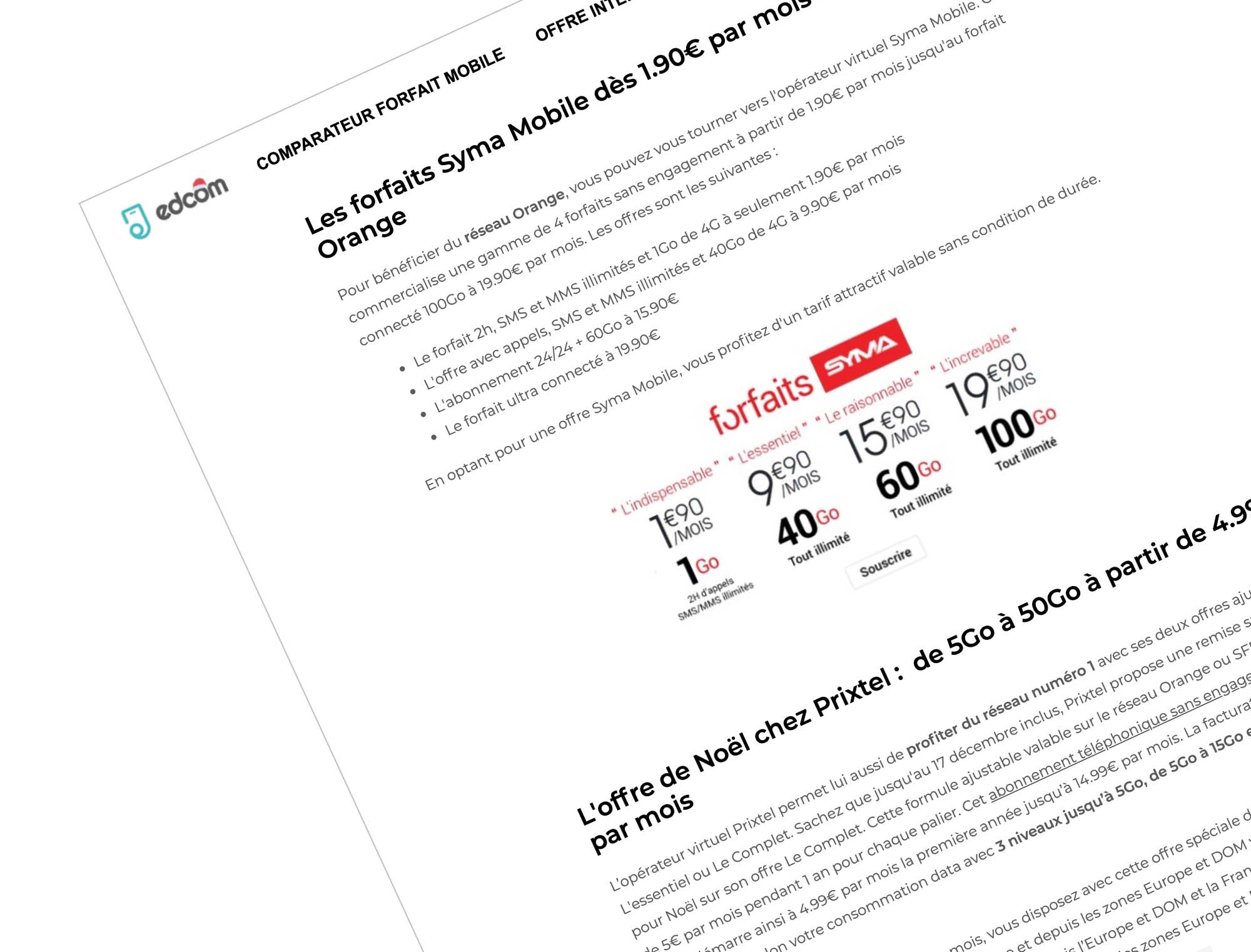 « Pour bénéficier du réseau Orange, vous pouvez vous tourner vers l’opérateur virtuel Syma Mobile. Celui-ci commercialise une gamme de 4 forfaits sans engagement à partir de 1.90€ par mois jusqu’au forfait connecté 100Go à 19.90€ par mois. Les offres sont les suivantes… »