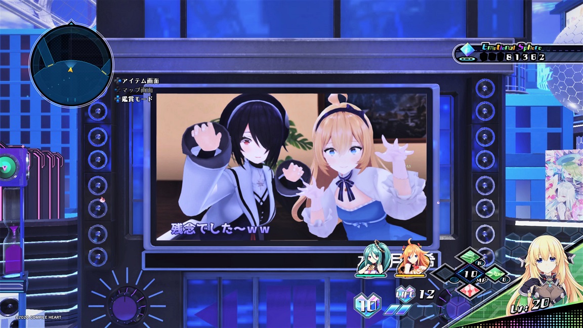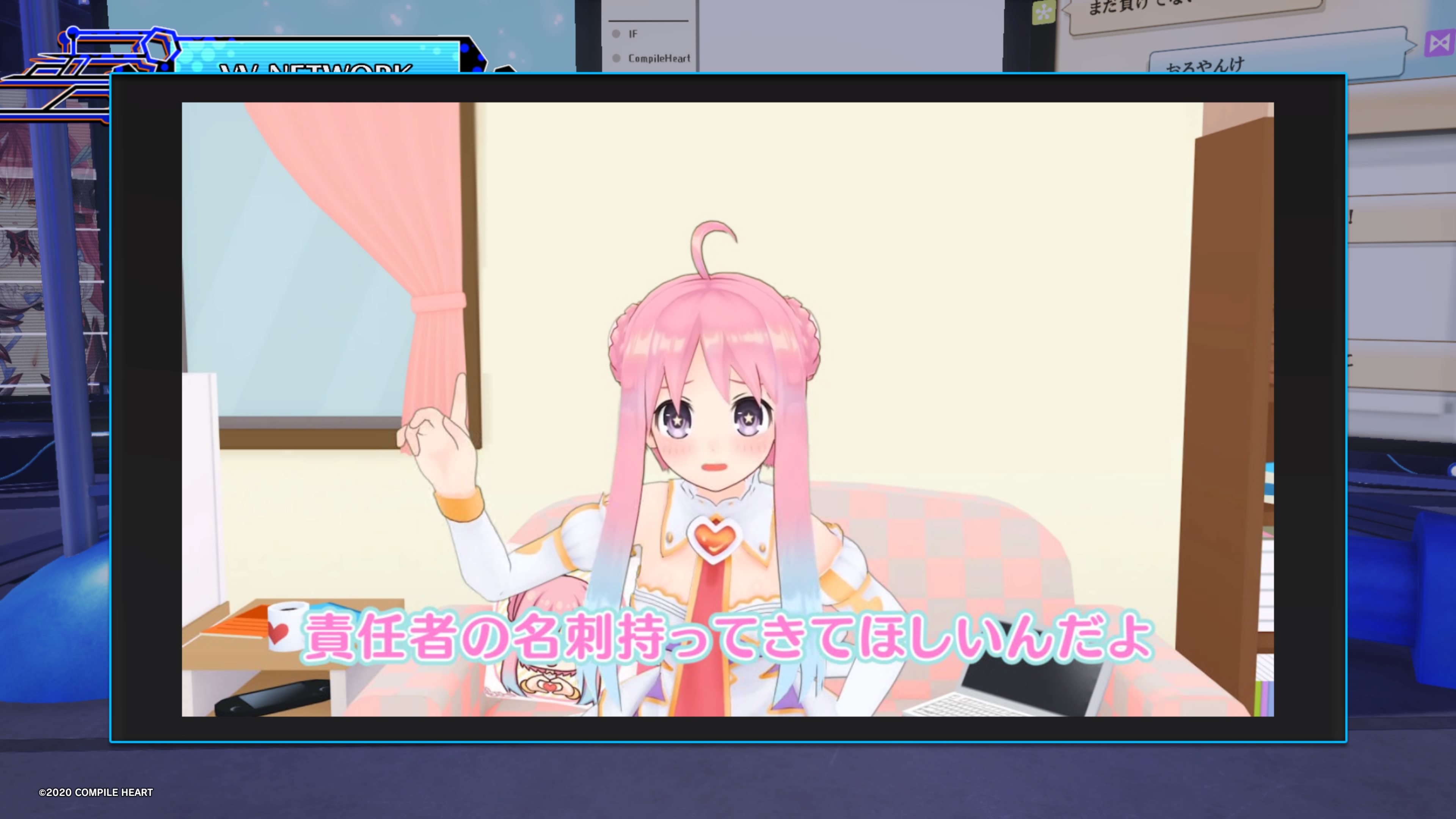 Ce n’est pas tout puisque Compile Heart a fait massivement appel aux Youtubeuses virtuelles pour agrémenter l’aventure. Ces V-tubeuses sont des personnages animés qui parlent de choses et d’autres en vidéo. Comme le ferait un Youtubeur en chair et en os, mais de manière nettement plus folklorique! Bref, Compile Heart a passé plein d’accord avec les créateurs des dits personnages, et c’est une myriade de V-tubeuses que l’on peut voir lors de écrans de chargement par exemple. De plus, celles-ci peuvent vous confier certaines missions de façon rigolote, et on peut même voir des petits clips sur les écrans géants installés dans le jeu lui-même!
