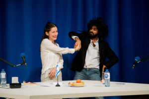 Après son spectacle Tunnel Boring Machine, Yuval Rozman revient sur la scène théâtrale avec le second volet de sa trilogie consacrée à Israël (Trilogie de ma terre). Brillant auteur et metteur en scène, il propose un désopilant talk-show radiophonique qui passe au scanner ses névroses identitaires et celles du peuple juif.