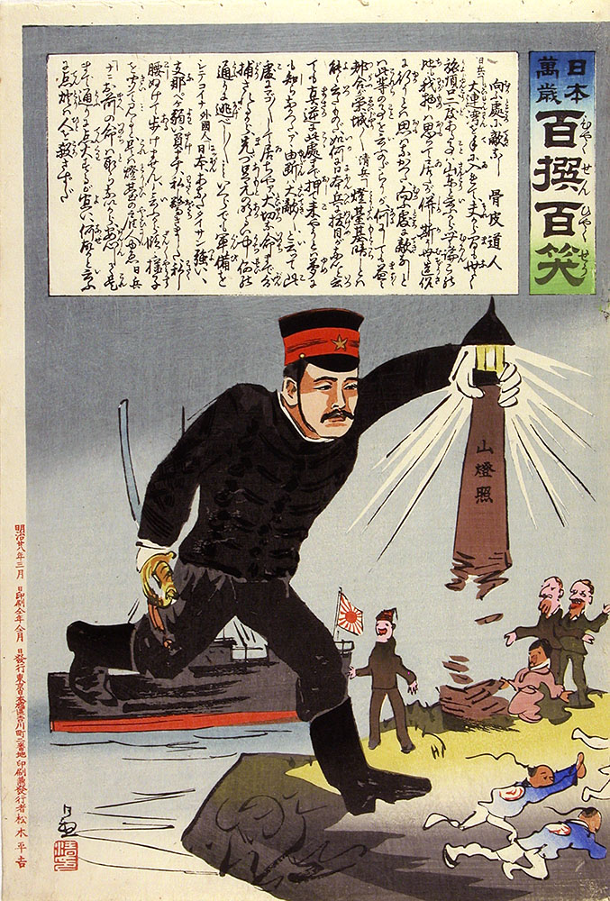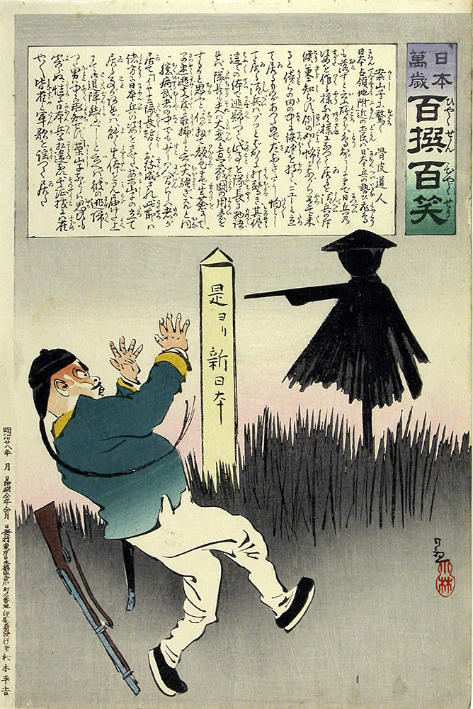 La presse se développe aussi : le Mainichi Shinbun (littéralement “journal de tous les jours) paraît pour la première fois en 1871. Mais pendant l’ère Meiji, celle-ci déforme presque autant qu’elle informe, comme en atteste la présence à l’exposition d’extraits de la série Hyakusen Hyakushô. Le nom, qui signifie “cent extraits, cent rires”, est un subtil jeu de mots sur ???? qui se prononce pareil mais veut dire “cent batailles, cent victoires”. En effet, ces estampes parodient des chroniques de guerre, comme ici contre la Chine en 1895. C’est en revanche un type de propagande qui choquerait aujourd’hui, les chinois étant présentés comme pleutres et les japonais surpuissants.
