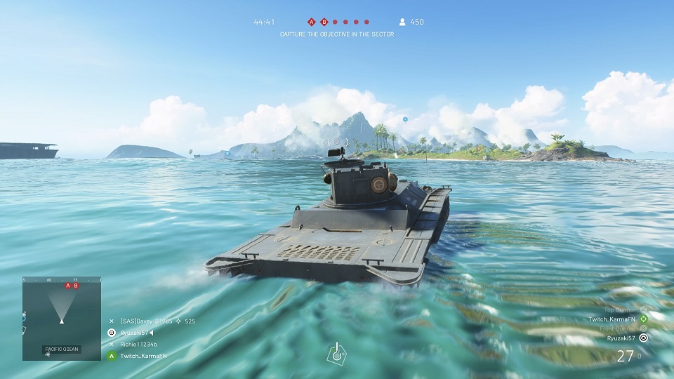Le plus extraordinaire reste l’ingéniosité des cartes en mode Breakthrough. Dans ce mode au gameplay asymétrique, les américains partent de leurs navires et doivent prendre tous les postes de commandement japonais les uns après les autres. Les joueurs débarquent sur les plages au moyen de barges à la manière du jour J, ou mieux encore, via des tanks amphibies! Cette faction dispose également de porte-avions desquels les joueurs peuvent faire partir des chasseur-bombardier pour affaiblir les défenses côtières. La météo vient en plus jouer des tours avec l’arrivée d’une tempête qui réduit drastiquement la visibilité et transforme complètement la situation du front.