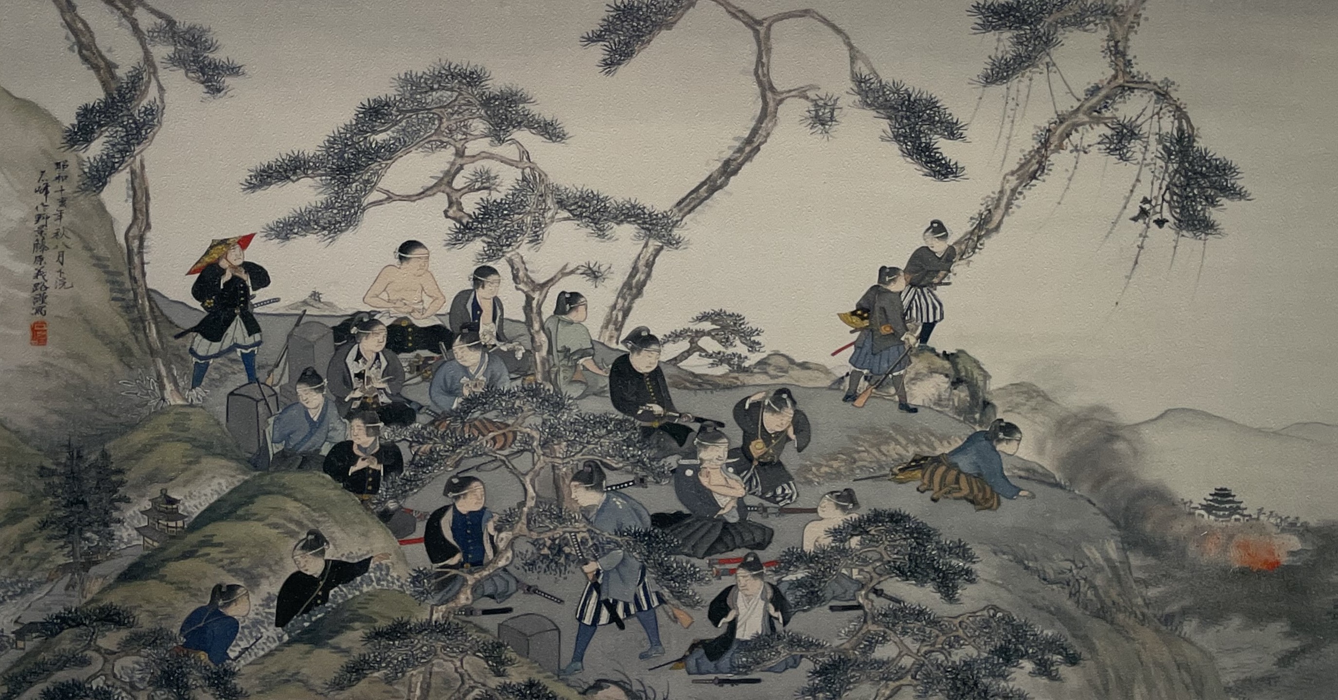 Le Byakkotai n’est donc pensé que comme une force d’appoint. Mais quand l’armée de Meiji presse le 22 août 1868, ces soldats inexpérimentés seront les premiers à voir le front. Mal équipés, et encore plus mal commandés, ils sont rapidement contraints à la fuite. Vaincus et donc déshonorés, ils se donnèrent la mort à Iimoriyama (prononcez “iimoriyama”). Un seul d’entre eux, Sadakichi Iinuma (là encore, “iinuma”), rate son suicide et est sauvé par des habitants. Il deviendra plus tard télégraphiste dans l’armée.